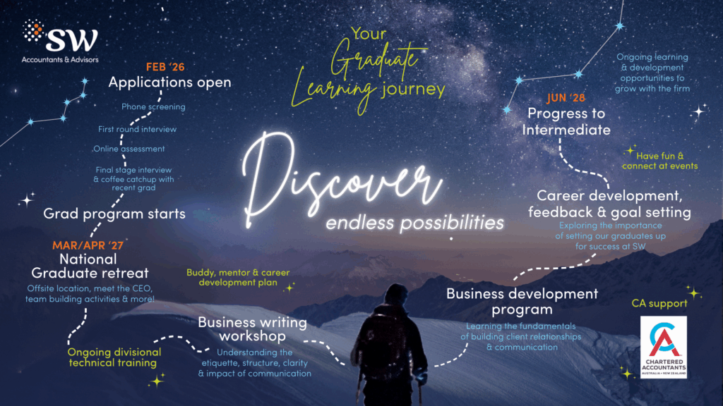 SW is a progressive advisory and accounting firm with a 90 year history in Australia. For graduates and students, SW represents a chance to take the lead and create opportunities for our clients and our people.